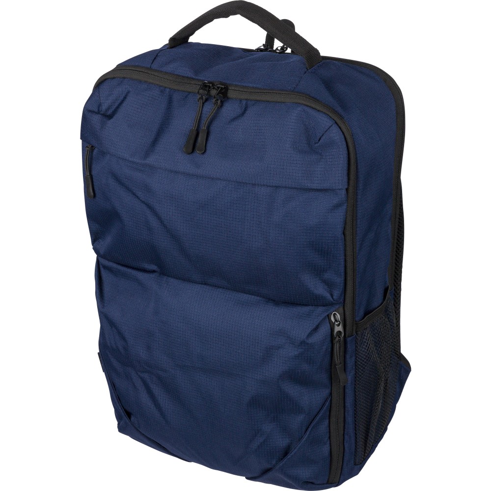 RPET 300D Ocean Bound anyagból készült hátizsák, amely újrahasznosított óceáni műanyagból készül, tartós és texturált felületű kialakítással. 20 literes űrtartalommal rendelkezik, két nagy cipzáras rekesszel, párnázott 15 hüvelykes laptoprekesszel, két elülső zsebbel, hálós oldalzsebbel és felső fogantyúval. Szellőző vállpántokkal, párnázott hátoldallal és bőröndre rögzíthető pánttal ellátva, a terméken Ocean Bound Plastic alapanyagra utaló címke található.