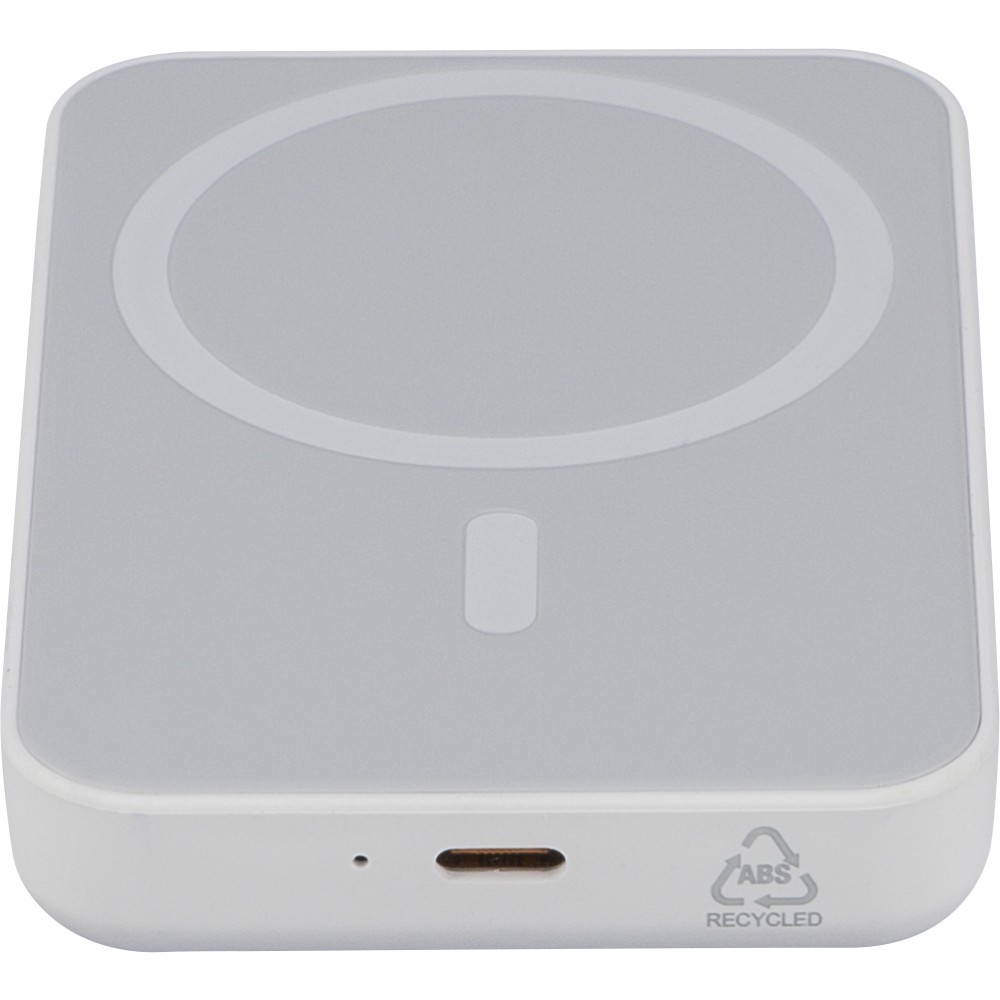 Újrahasznosított ABS anyagból készült vezeték nélküli töltős powerbank 5 000 mAh kapacitással és 15 W MagSafe kompatibilis vezeték nélküli töltéssel. Type-C in/out csatlakozással, beépített biztonsági védelmekkel és automatikus kikapcsolási funkcióval. Nem MagSafe készülékekhez fémgyűrűt tartalmaz. Az oldalán gravírozott recycled (újrahasznosított) alapanyagra utaló logó található. Selyempapírral bélelt barna dobozba csomagolva.